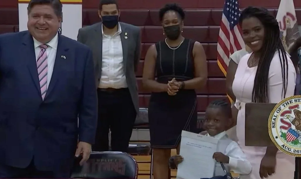 Jett Hawkins and his mother Ida Nelson stand with Governor JB Pritzker at the signing for the ban on hair discrimination.